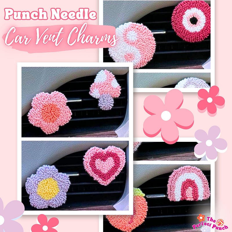 If you’re looking to spruce up your car’s interior, consider our punch needle car vent charms. These small, decorative pieces clip to your car’s air vents, adding a pop of color and texture to your dashboard. With a wide range of designs available, you can find the perfect charm to match your car’s interior or showcase your personality!