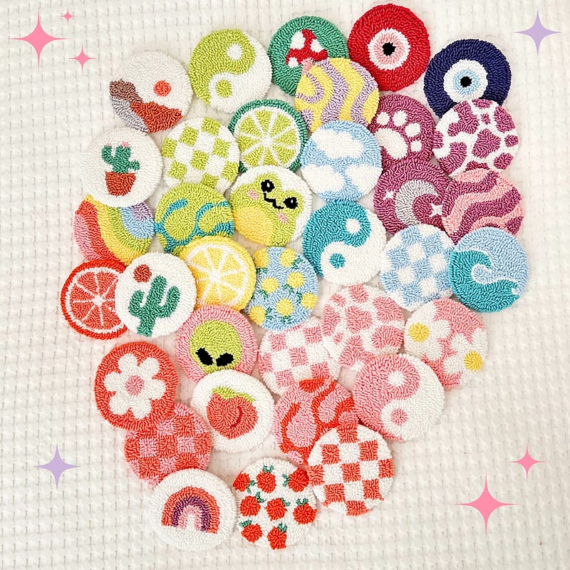Another unique product we create are punch needle car coasters! A punch needle car coaster are small, circular coasters that fit perfectly into your car’s cup holders, keeping them clean and stylish. With a wide range of designs available, you can personalize your car coasters to match your personality and add a pop of color to your daily commute. Our embroidery coasters truly complete your aesthetic car decor. Say goodbye to boring cup holders and hello to a touch of punch needle aesthetic!