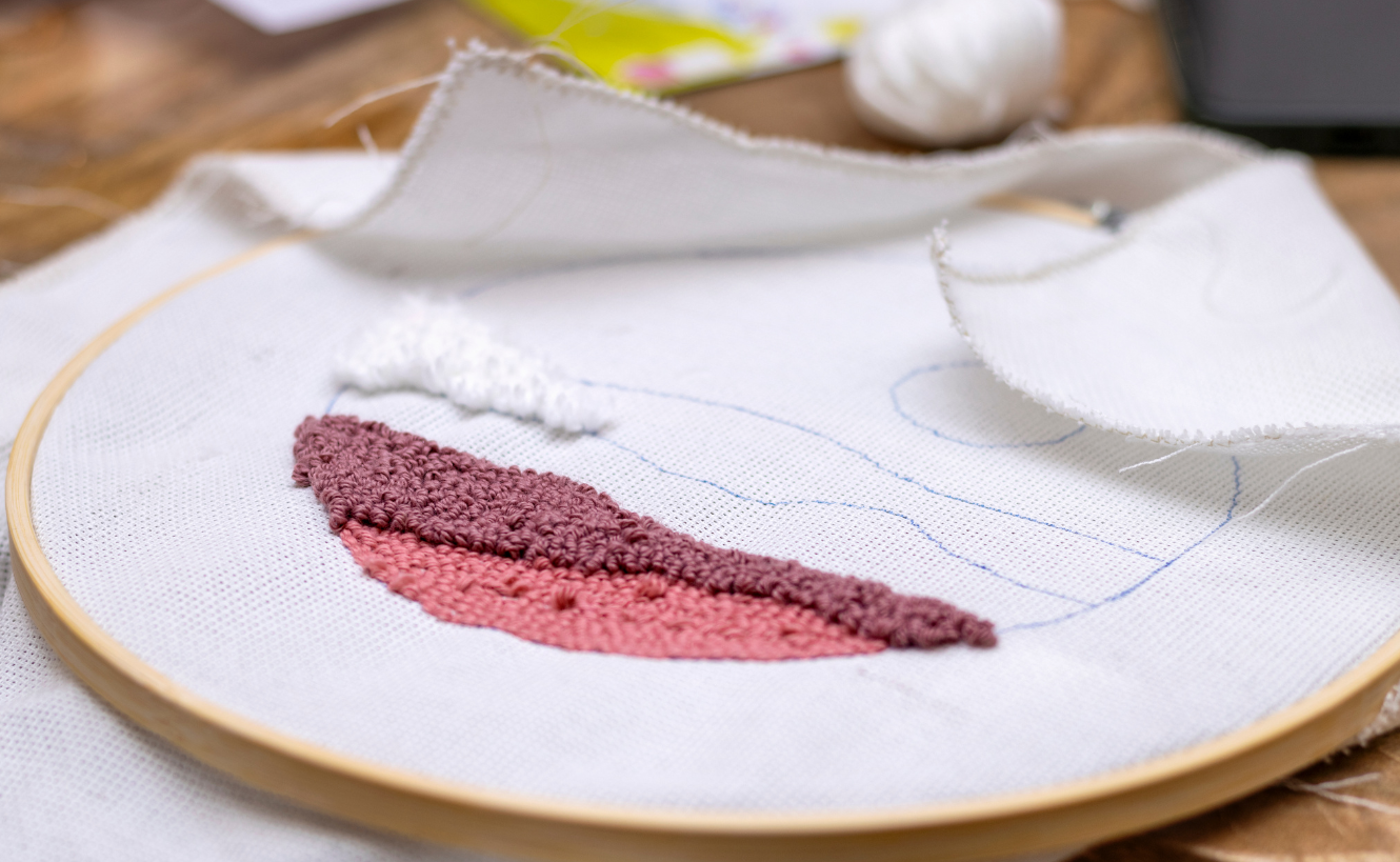 In addition to the punch needle tool and fabric, there are a few other tools that can make your punch needle embroidery experience a bit easier. A good embroidery hoop is essential in your punch needle journey. A non-slip embroidery hoop makes punching so much easier than if you were to use a regular wood embroidery hoop. It not only holds your fabric taut, but also helps in maintaining an even tension while punching. Look for a hoop that is larger than your design size, so you have enough space to work comfortably. Here’s my absolute favorite embroidery hoop: